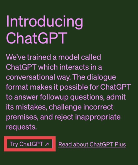 ①ChatGPTのサイトにアクセスして、「Try ChatGPT」をクリックしてログインします。